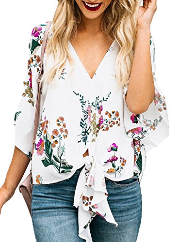 JunJunBag Women's 3/4 Sleeves Floral Printed V-Neck Bow Tie Casual Blouses Tops