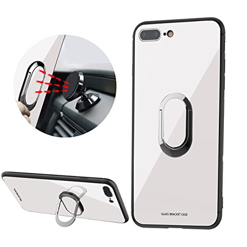 Newseego Compatible with iPhone 7 Plus Case,iPhone 8 Plus Case,Tempered Glass Hard Back Cover Anti-Scratches Soft TPU Bumper Case with 360 Rotating Magnet Finger Ring Holder for iPhone 7/8 Plus-White
