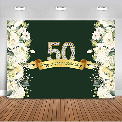 Mocsicka Happy 50th Birthday Backdrop 8x6ft Vinyl Elegant Fiftieth Birthday Banner for Lady White Flowers Diamond Decoration Photography Background