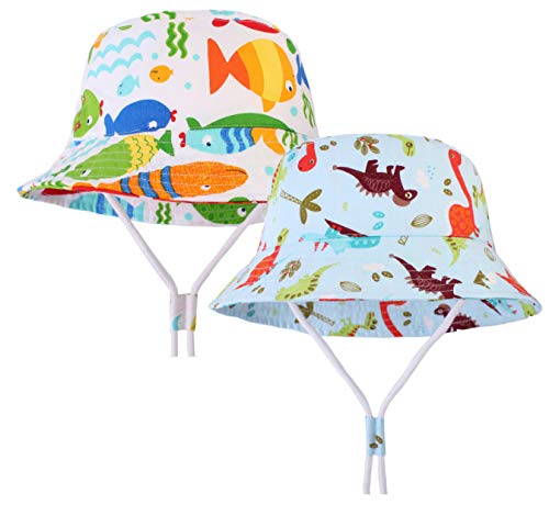 Bucket Hat Feature Dinosaurs for Boys and Girls Sun Protection Sun Hat with Chin Strap(Baby Toddler Youth) (Dinosaur and Fish, S 6-12M)