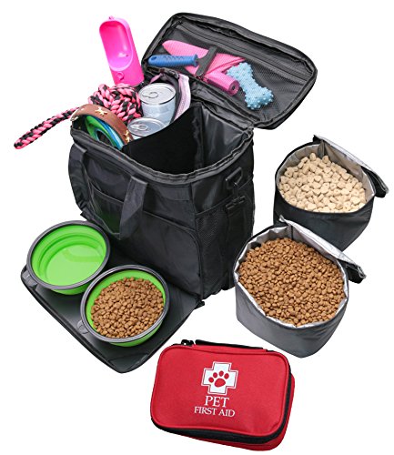 Labra Pet Dog Pet Travel Bag Carry On Luggage - Includes Bag, Pet First Aid Kit, Lined Food Containers, Collapsible Bowls and Placemat