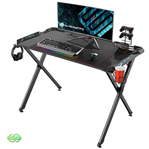 EUREKA ERGONOMIC X1-S Gaming Computer Desk 44.5" Gamer Desk PC Table Gaming Desks with LED Lights Large Carbon Fiber Surface Cup Holder Headphone Hook for Men Boyfriend Female Gift