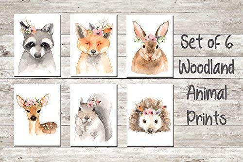 6 Fox Bunny Rabbit Raccoon Deer Fawn Squirrel Porcupine Boho Wall Art Print Woodland Bohemian Floral Nursery Baby Girl Printable Decor