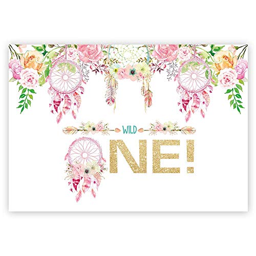 Funnytree 7x5ft Pink Flowers Wild one Backdrop Rustic First Birthday Baby Girl Photography Background Trible Floral Boho Dreamcatcher Party Invitation Decorations Cake Table Banner Photobooth