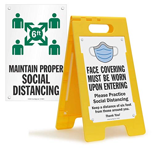 SmartSign “Face Covering Must Be Worn Upon Entering/Maintain Proper Social Distancing” Folding Floor Sign | 25" x 12" Plastic